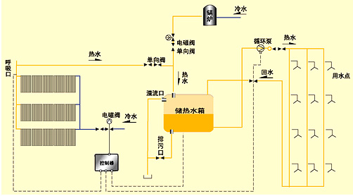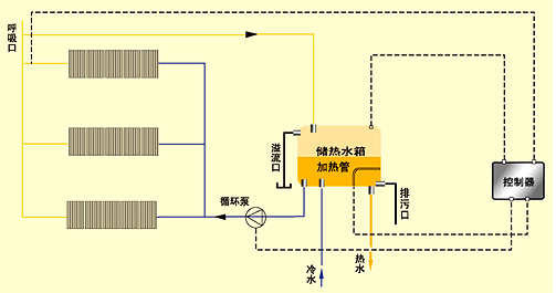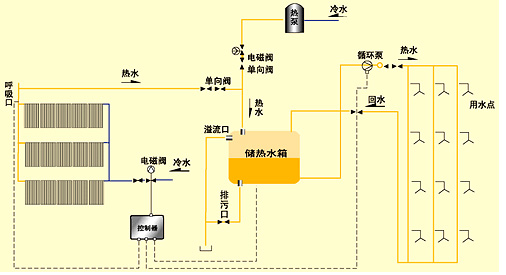 工作原理:在光照条件下将太阳能集热器采集的热量储存并加热水(或其他介质)使之温度升高,再将含有高能量的水或介质送入储热容器内(水箱)。光照不足或无光照条件下用常规能源补偿。