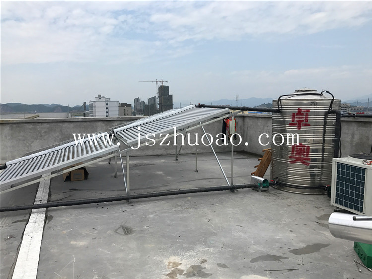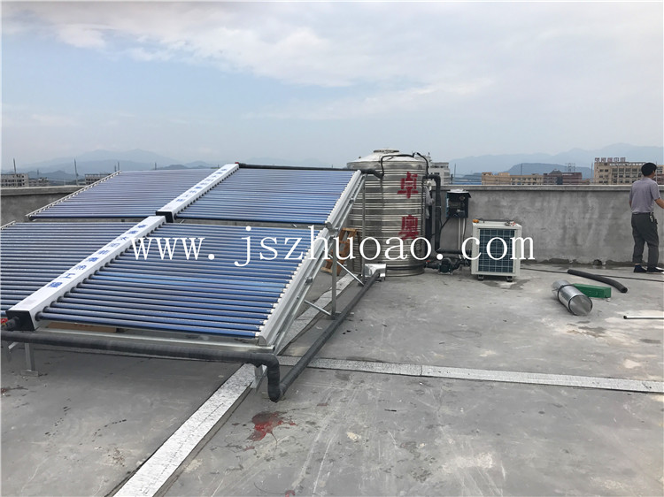 该项目使用2组太阳能集热器,配置一台2吨保温水箱,一台3匹商用空气能热泵进行辅助加热,24小时供应员工淋浴用水。